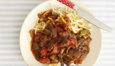 Μοσχαράκι με σάλτσα πιπεριάς και ζυμαρικά