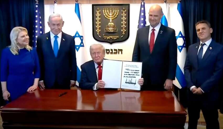 «Αυτή είναι μια ιστορική αυγή μιας Νέας Μέσης Ανατολής», δήλωσε ο Ντόναλντ Τραμπ κατά το ξεκίνημα της ομιλίας του στην Κνεσέτ, καταχειροκροτούμενος από όλους τους Ισραηλινούς βουλευτές που ήταν, όρθιοι ενώ πρόσθεσε πως «γενιές από τώρα θα θυμούνται αυτό ως τη στιγμή, ως το σημείο που όλα άρχισαν να αλλάζουν».