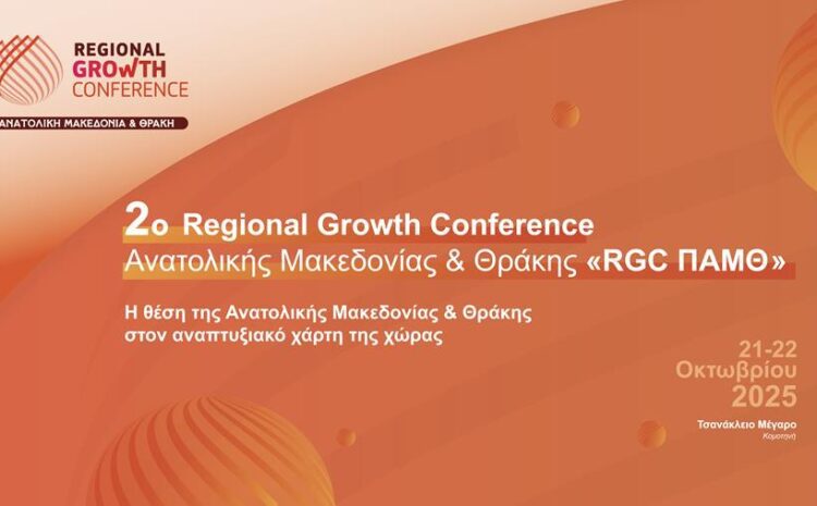 Το 2ο Περιφερειακό Αναπτυξιακό Συνέδριο “Regional Growth Conference Ανατολική Μακεδονία & Θράκη (RGC ΠΑΜΘ)” διοργανώνεται από την Εφημερίδα ΧΡΟΝΟΣ και την Εφημερίδα ΠΕΛΟΠΟΝΝΗΣΟΣ, σε συνδιοργάνωση με το Δημοκρίτειο Πανεπιστήμιο Θράκης, το Παρατηρητήριο Περιφερειακών Πολιτικών και την Περιφέρεια Ανατολικής Μακεδονίας και Θράκης, και θα διεξαχθεί 21-22 Οκτωβρίου 2025 (Τρίτη, Τετάρτη) στο Τσανάκλειο Μέγαρο.