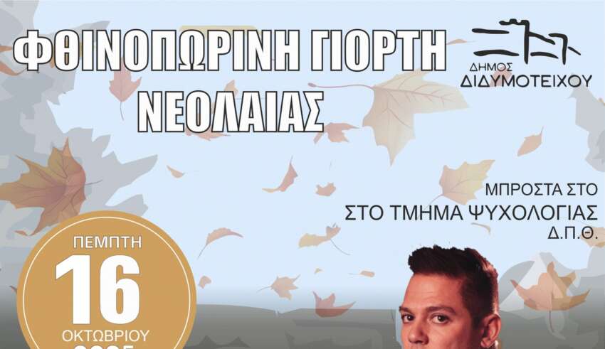 Ο Δήμος Διδυμοτείχου, διοργανώνει την Πέμπτη 16 Οκτωβρίου 2025 και ώρα 19:30 την εορταστική εκδήλωση «Φθινοπωρινή Γιορτή Νεολαίας 2025», στον αύλειο χώρο του Τμήματος Ψυχολογίας στο Διδυμότειχο.