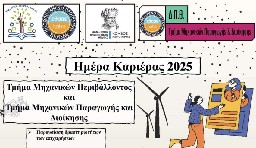 Την Πέμπτη 16 Οκτωβρίου 2025 στις 10.00 π.μ., προσκαλούμε όλους τους τελειόφοιτους και νέους μηχανικούς που αναζητούν εργασία στην ημερίδα «Ημέρα Καριέρας 2025» που συνδιοργανώνουν τα τμήματα Μηχανικών Περιβάλλοντος και Μηχανικών Παραγωγής και Διοίκησης του Δημοκρίτειου Πανεπιστημίου Θράκης στους χώρους του Τμήματος Μηχανικών Περιβάλλοντος στα ΠΡΟΚΑΤ (Ξάνθη).