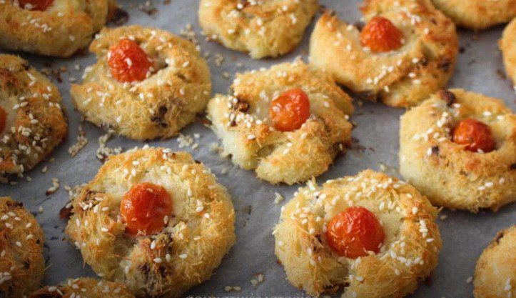 Γεμίζουμε 24 φόρμες μικρές για κεκάκια που έχουμε προηγουμένως βουτυρώσει καλά, πασπαλίζουμε με το σουσάμι και βάζουμε στη μέση ένα ντοματίνι.