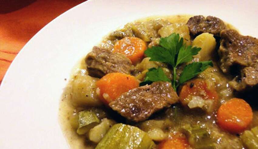 Ζεσταίνουμε το ελαιόλαδο και σοτάρουμε το κρεμμύδι και τα πράσα για περίπου 4 λεπτά, μέχρι να μαλακώσουν λίγο. Προσθέτουμε τους μοσχαρίσιους κύβους και τους σοτάρουμε και αυτούς, ώσπου να ροδίσουν, γυρίζοντάς τους μερικές φορές μέσα στο λάδι. Προσθέτουμε νερό τόσο που να σκεπάζει τα υλικά, τη ρίγανη, το θυμάρι και το μπαχάρι και αλατοπιπερώνουμε. Αφήνουμε το μοσχάρι να μαγειρευτεί για 45 λεπτά σε χαμηλή προς μέτρια φωτιά, συμπληρώνοντας αν χρειαστεί ζεστό νερό. Στη συνέχεια, προσθέτουμε τα λαχανικά (καρότα, πατάτες, σελινόριζα, σέλερι) και μαγειρεύουμε για περίπου άλλα 45 λεπτά σε χαμηλή προς μέτρια φωτιά, ώσπου να μαλακώσουν και να χυλώσει η σάλτσα. Αν χρειαστεί προσθέτουμε λίγο ζεστό νερό.