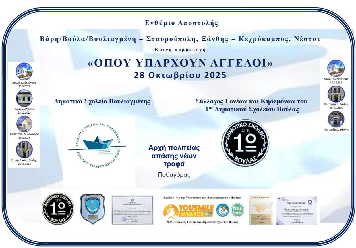 Στην Σταυρούπολη Ξάνθης και τον Κεχρόκαμπο Νέστου θα βρεθούν για μια ακόμα χρονιά σχολεία της Βούλας και της Βουλιαγμένης για να πάρουν μέρος στην παρέλαση της 28ης Οκτωβρίου στο πλαίσιο της πρωτοβουλίας «Όπου Υπάρχουν Άγγελοι». Η ιδιοκτήτρια της επιχείρησης ‘’Meligeysis’’, Γεύση Τουλουμίδου τόνισε στο «Ε» πως τα παιδιά επισκέφθηκαν πέρυσι την περιοχή και παρελάσαν στην Σταυρούπολη μαζί με το Δημοτικό Σχολείο και τα παιδιά του τόπου.