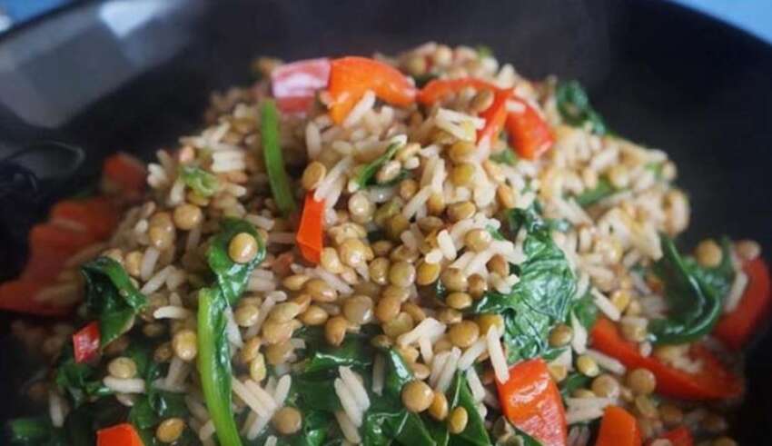 Φακόρυζο με σπανάκι και κόκκινες πιπεριές