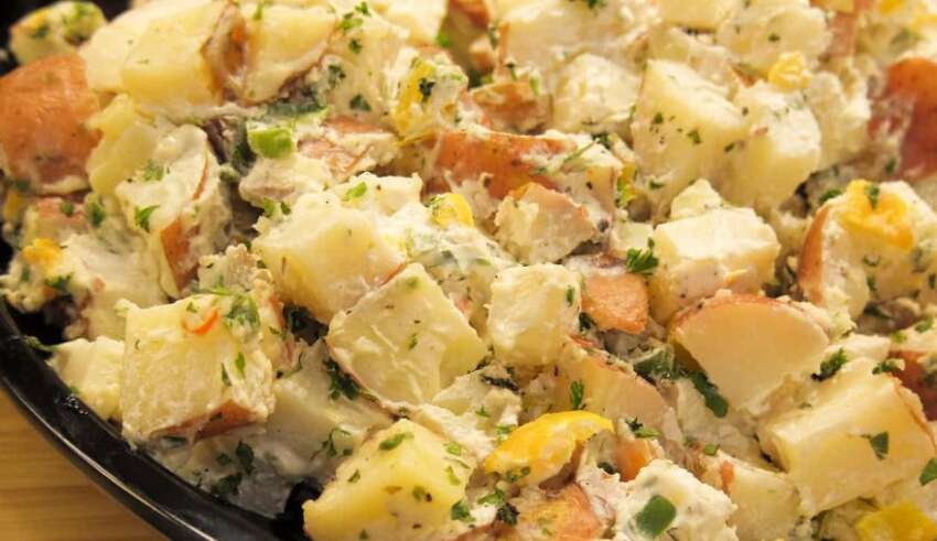 Στη συνέχεια προσθέτουμε τα υπόλοιπα υλικά και ανακατεύουμε ελαφρά ώστε να μην σπάσουν οι πατάτες. Βάζουμε για λίγο στο ψυγείο και σερβίρουμε κρύα.