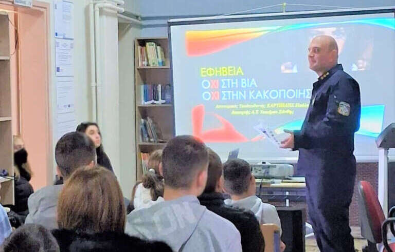Ενημερωτική ομιλία σε μαθητές του Ενιαίου Ειδικού Επαγγελματικού Λυκείου Ξάνθης πραγματοποίησε ο Διοικητής του Α.Τ. Τοπείρου με αντικείμενο τον σχολικό εκφοβισμό, τα φαινόμενα βίας μεταξύ ανηλίκων, το cyberbullying και τον ρόλο της Ελληνικής Αστυνομίας στην πρόληψη και αντιμετώπισή τους, τονίζοντας πως η αστυνομία βρίσκεται κοντά στα παιδιά.